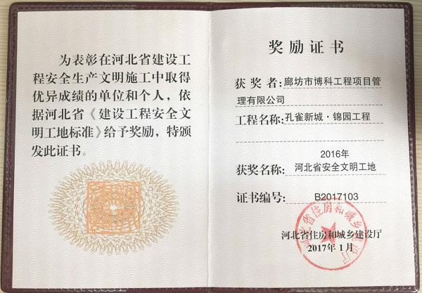 近日,2016年度河北省安全文明工地获奖企业名单经公示后最终出炉,廊坊市博科工程项目管理有限公司监理的孔雀新城•锦园等建设工程项目,在施工过程中能够始终保持高标准,未发生人员伤亡事故,被评为2016年河北省安全文明工地。